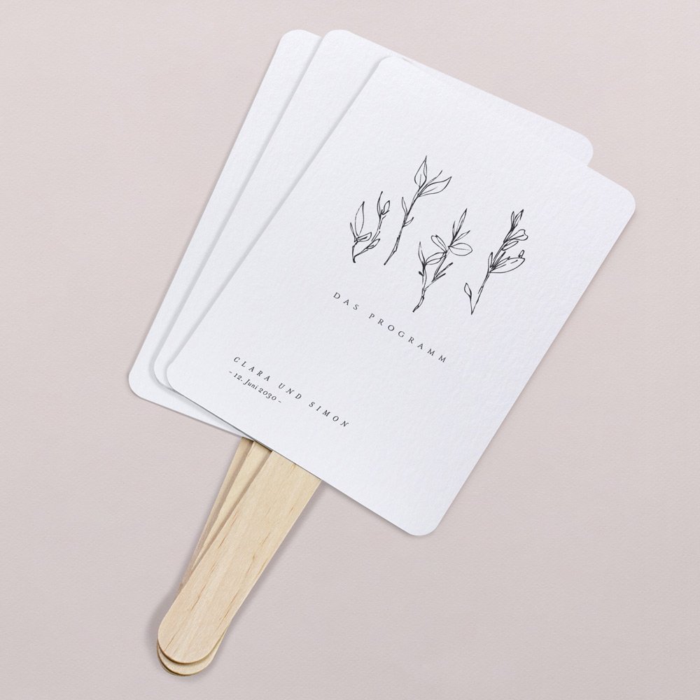 Gestalten Sie die Hochzeitsfächer mit dem Programmablauf Ihrer Feier, um Ihre Gäste auf dem Laufenden zu halten. Der Programmfächer informiert Ihre Gäste über die einzelnen Programmpunkte und sorgt für einen reibungslosen Ablauf Ihrer Hochzeitsfeier. Zudem können sich Ihre Gäste an heißen Tagen mit dem Fächer etwas frische Luft zufächeln.