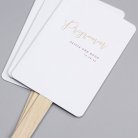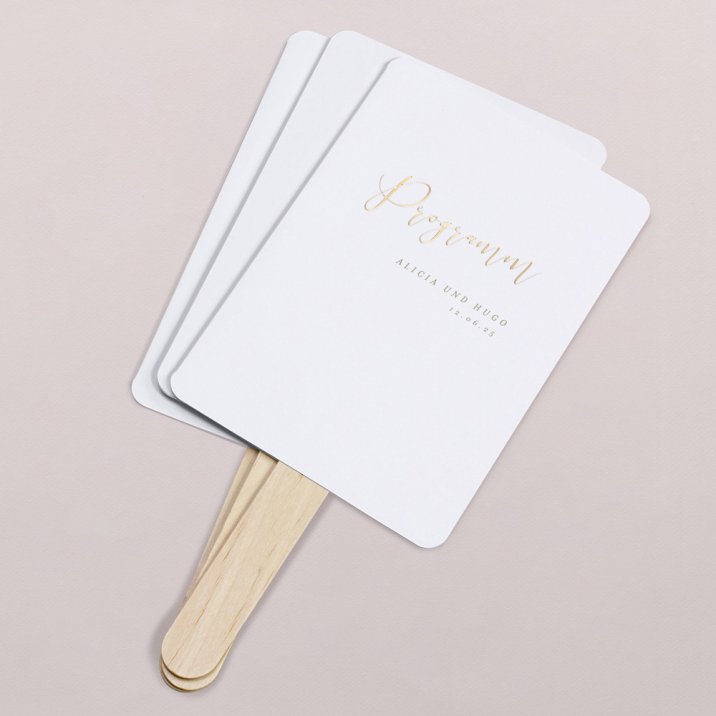 Gestalten Sie die Hochzeitsfächer mit dem Programmablauf Ihrer Feier, um Ihre Gäste auf dem Laufenden zu halten. Der Programmfächer informiert Ihre Gäste über die einzelnen Programmpunkte und sorgt für einen reibungslosen Ablauf Ihrer Hochzeitsfeier. Zudem können sich Ihre Gäste an heißen Tagen mit dem Fächer etwas frische Luft zufächeln.