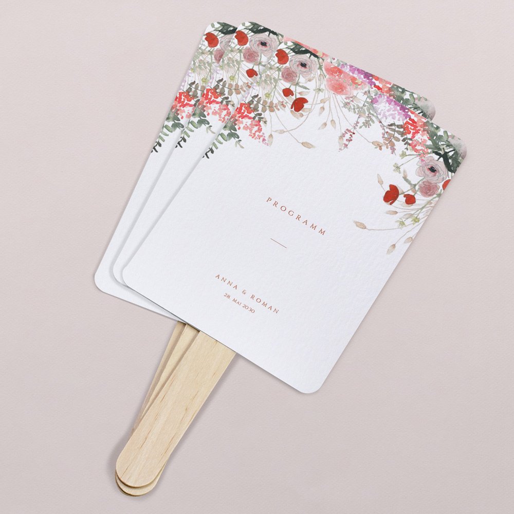 Gestalten Sie die Hochzeitsfächer mit dem Programmablauf Ihrer Feier, um Ihre Gäste auf dem Laufenden zu halten. Der Programmfächer informiert Ihre Gäste über die einzelnen Programmpunkte und sorgt für einen reibungslosen Ablauf Ihrer Hochzeitsfeier. Zudem können sich Ihre Gäste an heißen Tagen mit dem Fächer etwas frische Luft zufächeln.