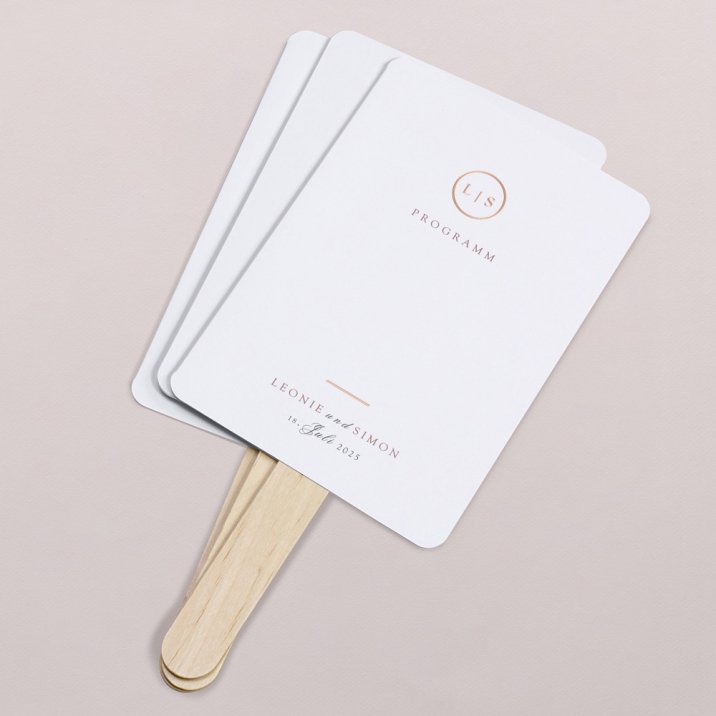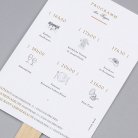 Gestalten Sie die Hochzeitsfächer mit dem Programmablauf Ihrer Feier, um Ihre Gäste auf dem Laufenden zu halten. Der Programmfächer informiert Ihre Gäste über die einzelnen Programmpunkte und sorgt für einen reibungslosen Ablauf Ihrer Hochzeitsfeier. Zudem können sich Ihre Gäste an heißen Tagen mit dem Fächer etwas frische Luft zufächeln.
