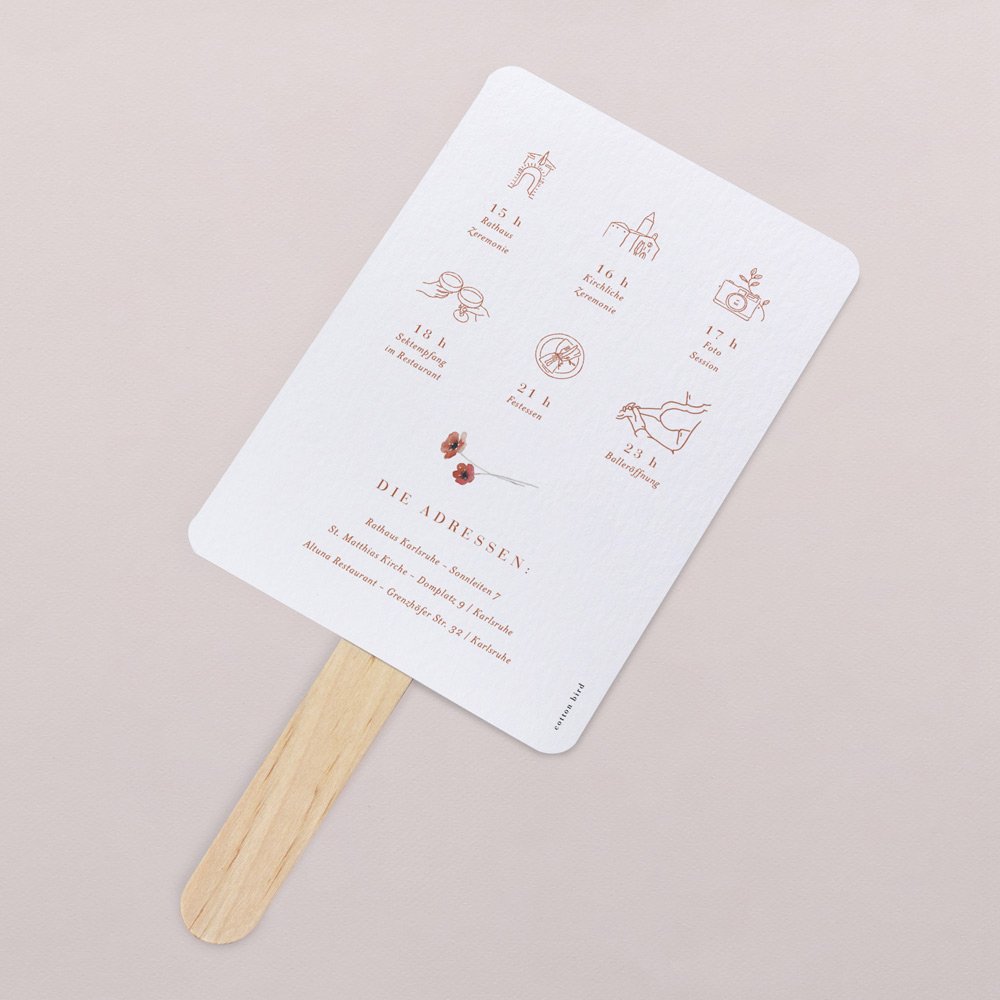Gestalten Sie die Hochzeitsfächer mit dem Programmablauf Ihrer Feier, um Ihre Gäste auf dem Laufenden zu halten. Der Programmfächer informiert Ihre Gäste über die einzelnen Programmpunkte und sorgt für einen reibungslosen Ablauf Ihrer Hochzeitsfeier. Zudem können sich Ihre Gäste an heißen Tagen mit dem Fächer etwas frische Luft zufächeln.