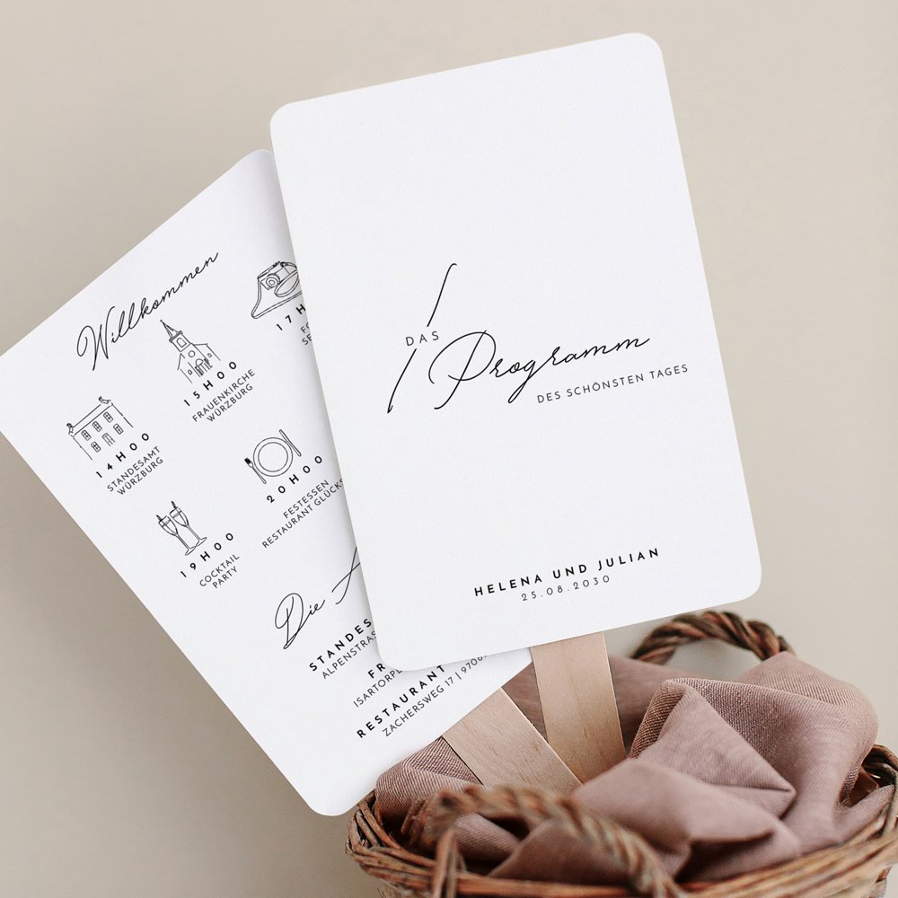 Gestalten Sie die Hochzeitsfächer mit dem Programmablauf Ihrer Feier, um Ihre Gäste auf dem Laufenden zu halten. Der Programmfächer informiert Ihre Gäste über die einzelnen Programmpunkte und sorgt für einen reibungslosen Ablauf Ihrer Hochzeitsfeier. Zudem können sich Ihre Gäste an heißen Tagen mit dem Fächer etwas frische Luft zufächeln.