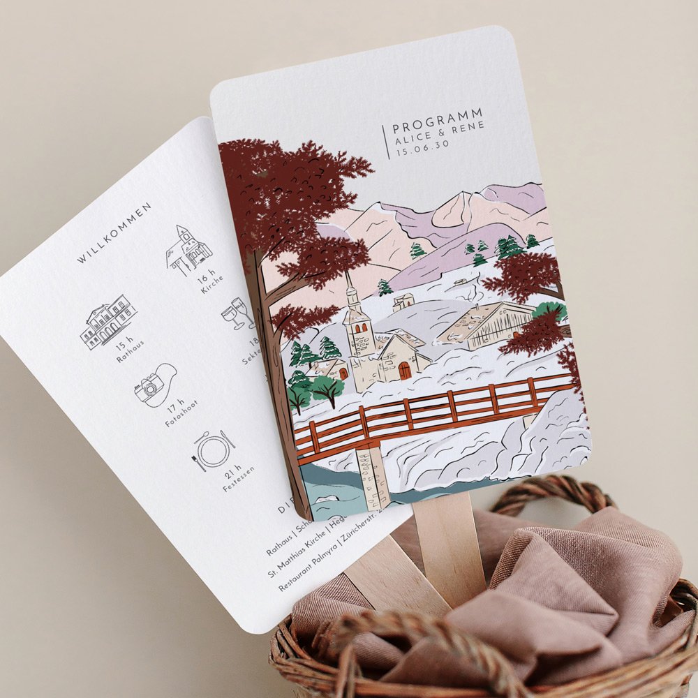 Gestalten Sie die Hochzeitsfächer mit dem Programmablauf Ihrer Feier, um Ihre Gäste auf dem Laufenden zu halten. Der Programmfächer informiert Ihre Gäste über die einzelnen Programmpunkte und sorgt für einen reibungslosen Ablauf Ihrer Hochzeitsfeier. Zudem können sich Ihre Gäste an heißen Tagen mit dem Fächer etwas frische Luft zufächeln.