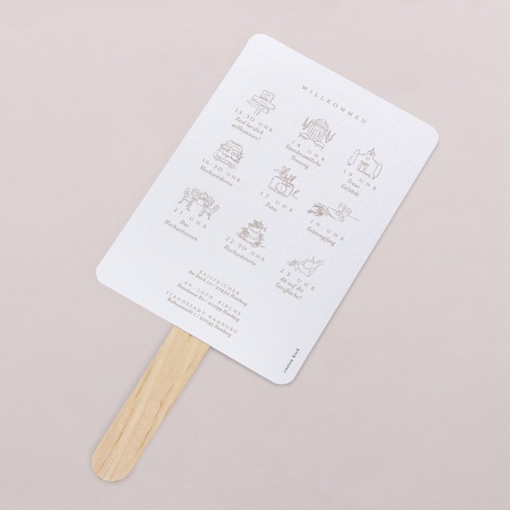 Gestalten Sie die Hochzeitsfächer mit dem Programmablauf Ihrer Feier, um Ihre Gäste auf dem Laufenden zu halten. Der Programmfächer informiert Ihre Gäste über die einzelnen Programmpunkte und sorgt für einen reibungslosen Ablauf Ihrer Hochzeitsfeier. Zudem können sich Ihre Gäste an heißen Tagen mit dem Fächer etwas frische Luft zufächeln.