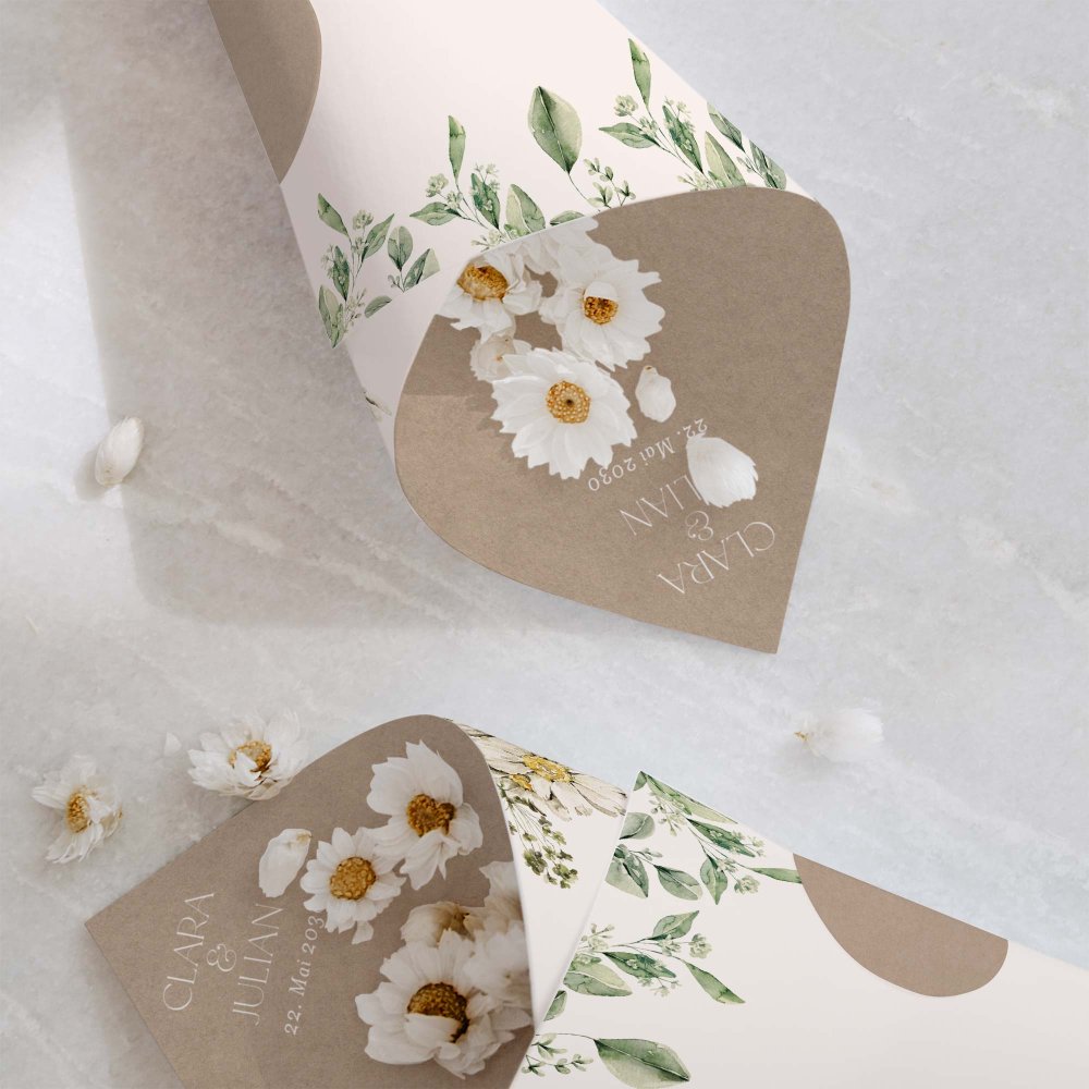 Das perfekte Accessoire für den perfekten Moment. Diese kleinen Spitztüten im passenden Design zu Ihren Einladungskarten können mit Ihren Namen bedruckt und mit Blütenblättern, Reis oder Konfetti gefüllt werden.