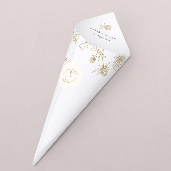 Das perfekte Accessoire für den perfekten Moment. Diese kleinen Spitztüten im passenden Design zu Ihren Einladungskarten können mit Ihren Namen bedruckt und mit Blütenblättern, Reis oder Konfetti gefüllt werden.
