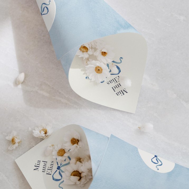 Das perfekte Accessoire für den perfekten Moment. Diese kleinen Spitztüten im passenden Design zu Ihren Einladungskarten können mit Ihren Namen bedruckt und mit Blütenblättern, Reis oder Konfetti gefüllt werden.