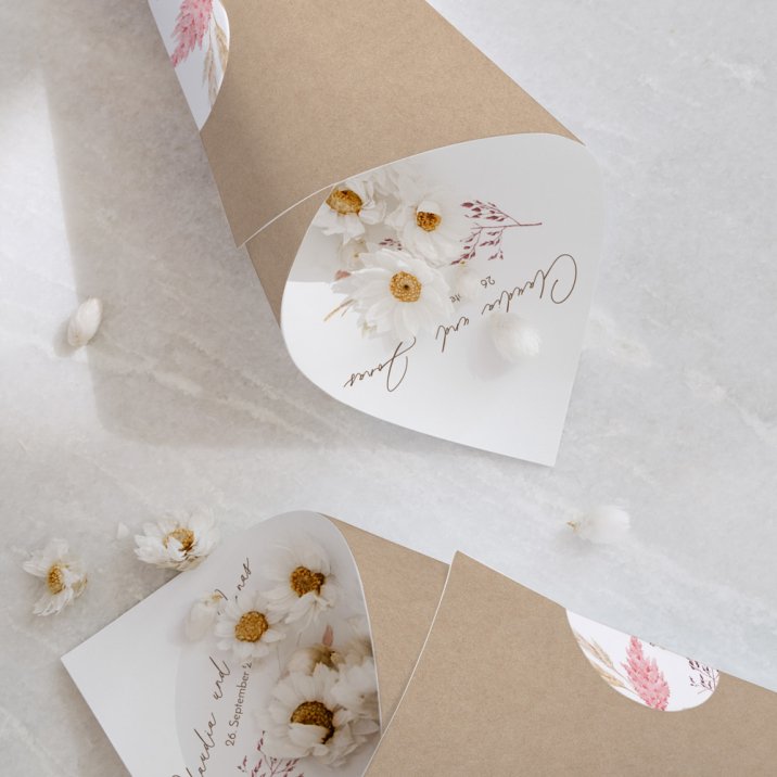 Das perfekte Accessoire für den perfekten Moment. Diese kleinen Spitztüten im passenden Design zu Ihren Einladungskarten können mit Ihren Namen bedruckt und mit Blütenblättern, Reis oder Konfetti gefüllt werden.
