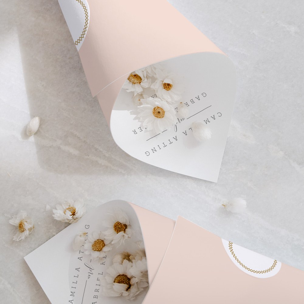 Das perfekte Accessoire für den perfekten Moment. Diese kleinen Spitztüten im passenden Design zu Ihren Einladungskarten können mit Ihren Namen bedruckt und mit Blütenblättern, Reis oder Konfetti gefüllt werden.