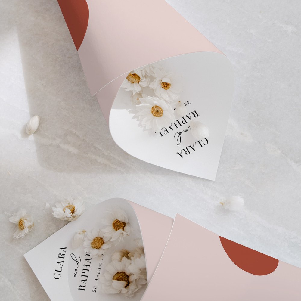 Das perfekte Accessoire für den perfekten Moment. Diese kleinen Spitztüten im passenden Design zu Ihren Einladungskarten können mit Ihren Namen bedruckt und mit Blütenblättern, Reis oder Konfetti gefüllt werden.