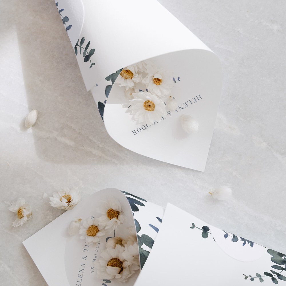 Das perfekte Accessoire für den perfekten Moment. Diese kleinen Spitztüten im passenden Design zu Ihren Einladungskarten können mit Ihren Namen bedruckt und mit Blütenblättern, Reis oder Konfetti gefüllt werden.