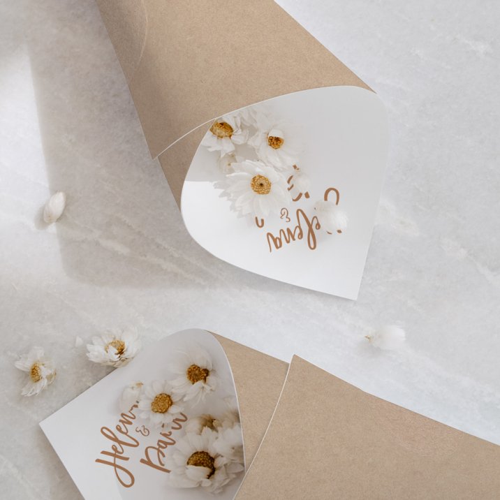 Das perfekte Accessoire für den perfekten Moment. Diese kleinen Spitztüten im passenden Design zu Ihren Einladungskarten können mit Ihren Namen bedruckt und mit Blütenblättern, Reis oder Konfetti gefüllt werden.