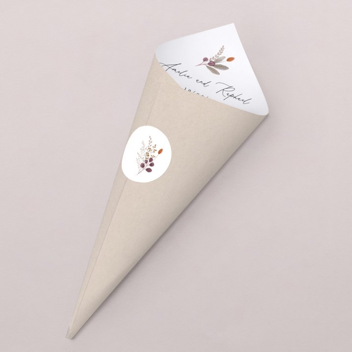 Das perfekte Accessoire für den perfekten Moment. Diese kleinen Spitztüten im passenden Design zu Ihren Einladungskarten können mit Ihren Namen bedruckt und mit Blütenblättern, Reis oder Konfetti gefüllt werden.