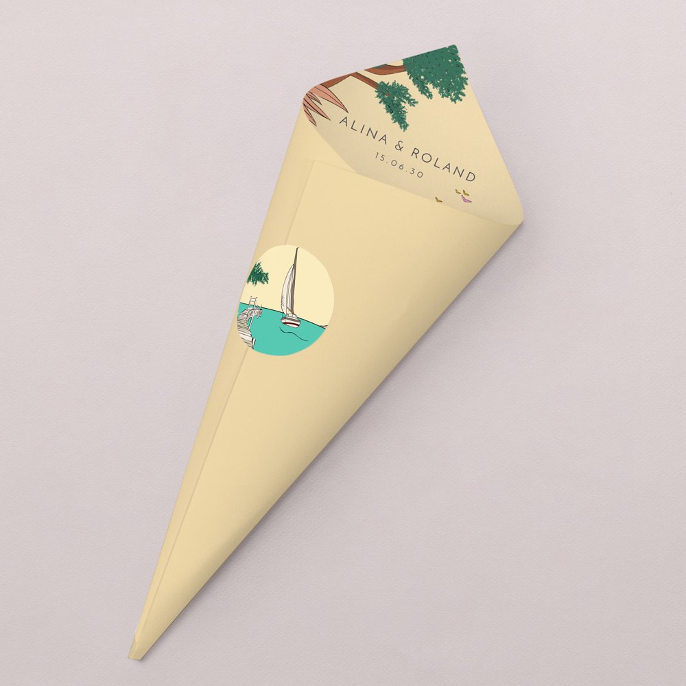 Das perfekte Accessoire für den perfekten Moment. Diese kleinen Spitztüten im passenden Design zu Ihren Einladungskarten können mit Ihren Namen bedruckt und mit Blütenblättern, Reis oder Konfetti gefüllt werden.