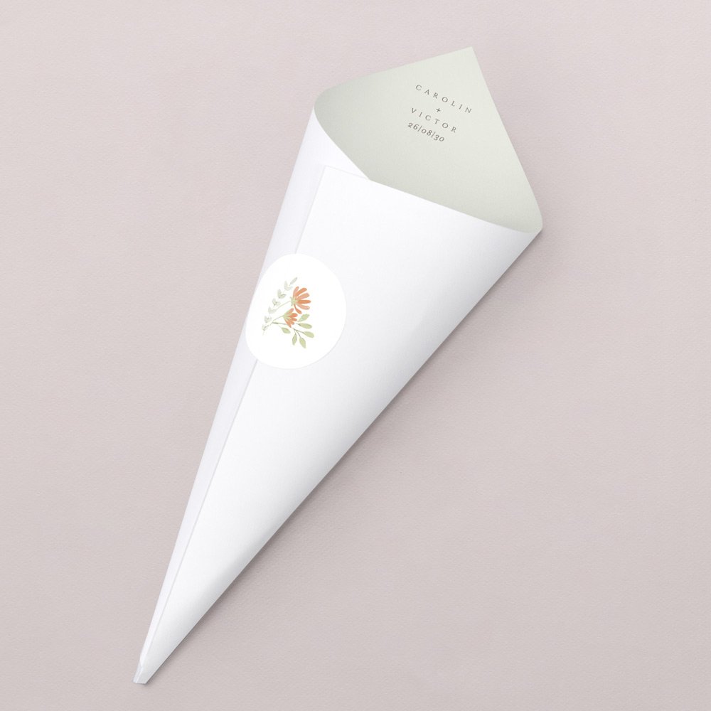 Das perfekte Accessoire für den perfekten Moment. Diese kleinen Spitztüten im passenden Design zu Ihren Einladungskarten können mit Ihren Namen bedruckt und mit Blütenblättern, Reis oder Konfetti gefüllt werden.