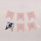 Diese Girlande aus 16 doppelseitigen Wimpeln kann mit Ihren Vornamen, einem Foto, dem Datum Ihrer Hochzeit, einem kleinen Willkommensgruß oder anderem Text gestaltet werden.