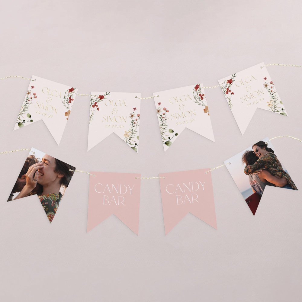 Diese Girlande aus 16 doppelseitigen Wimpeln kann mit Ihren Vornamen, einem Foto, dem Datum Ihrer Hochzeit, einem kleinen Willkommensgruß oder anderem Text gestaltet werden.