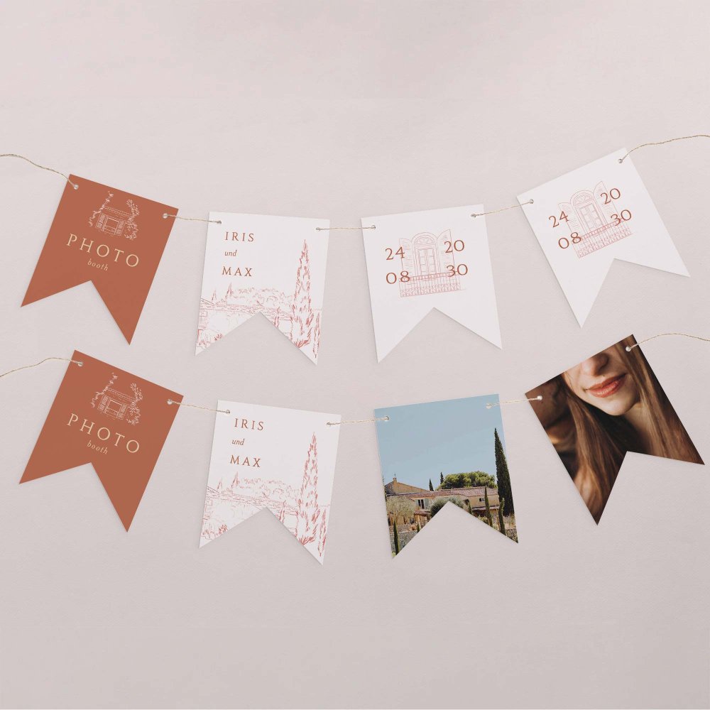 Diese Girlande aus 16 doppelseitigen Wimpeln kann mit Ihren Vornamen, einem Foto, dem Datum Ihrer Hochzeit, einem kleinen Willkommensgruß oder anderem Text gestaltet werden.