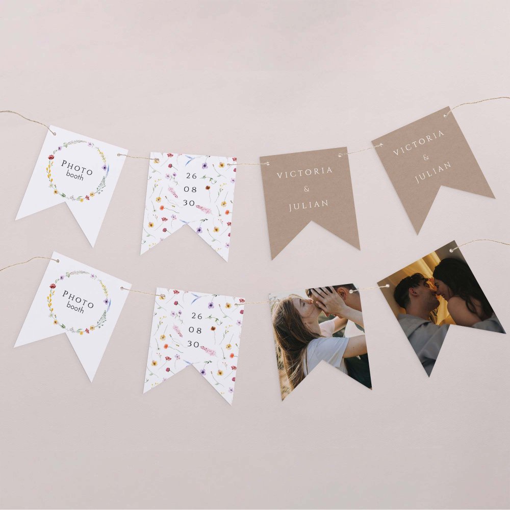 Diese Girlande aus 16 doppelseitigen Wimpeln kann mit Ihren Vornamen, einem Foto, dem Datum Ihrer Hochzeit, einem kleinen Willkommensgruß oder anderem Text gestaltet werden.
