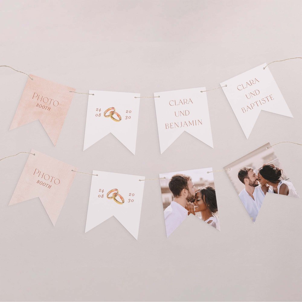 Diese Girlande aus 16 doppelseitigen Wimpeln kann mit Ihren Vornamen, einem Foto, dem Datum Ihrer Hochzeit, einem kleinen Willkommensgruß oder anderem Text gestaltet werden.