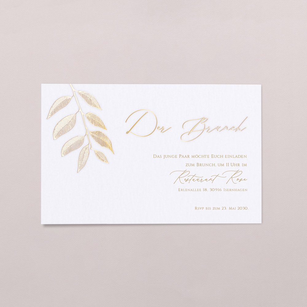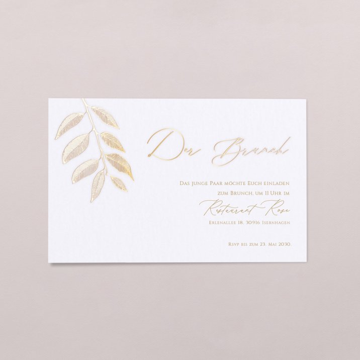Gestalten Sie Ihre Einleger mit Informationen, die auf der Einladungskarte keinen Platz gefunden haben oder mit einer seperaten Einladung für bestimmte Gäste, z.B. zum Brunch am Morgen nach der Feier. Bei einseitig personalisierten Einlegern bleibt die Rückseite der Karte weiß.