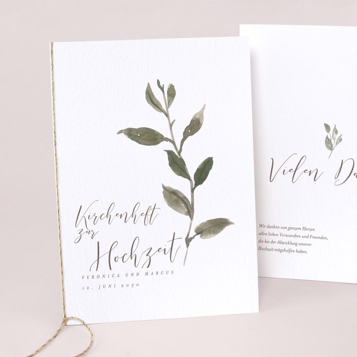 Gestalten Sie den Einband ganz nach Ihren Wünschen – mit Ihren Namen, dem Hochzeitsdatum und einer persönlichen Dankeswidmung auf der Rückseite. Drucken Sie Liedtexte, Gebete und Reden im A4-Format aus, falten Sie sie in der Mitte und legen Sie sie in das Kirchenheft. Mit einem hübschen Band (optional bestellbar) lassen sich die Seiten stilvoll befestigen – so entsteht Ihr individuelles Programmheft für die Trauung.