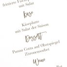Die Vorfreude auf kulinarische Highlights macht jedes Fest noch besonderer! Lassen Sie Ihre Gäste schon vor dem ersten Gang wissen, welche Köstlichkeiten sie erwarten – von der Vorspeise über das Hauptgericht bis zum Dessert, begleitet von einer erlesenen Auswahl an Getränken. Gestalten Sie eine stilvolle Menükarte oder Getränkekarte, die perfekt mit Ihrer Einladung und Tischdekoration harmoniert. So informieren Sie nicht nur über die Speisen und Getränke, sondern setzen zugleich ein dekoratives Highlight. Unser Tipp: Platzieren Sie die Karten direkt an jedem Sitzplatz oder zentral auf den Tischen, um Ihre Festtafel stilvoll abzurunden.