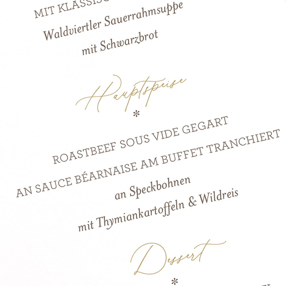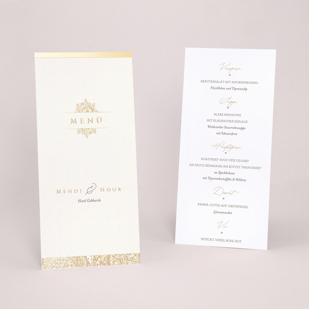 Die Vorfreude auf kulinarische Highlights macht jedes Fest noch besonderer! Lassen Sie Ihre Gäste schon vor dem ersten Gang wissen, welche Köstlichkeiten sie erwarten – von der Vorspeise über das Hauptgericht bis zum Dessert, begleitet von einer erlesenen Auswahl an Getränken. Gestalten Sie eine stilvolle Menükarte oder Getränkekarte, die perfekt mit Ihrer Einladung und Tischdekoration harmoniert. So informieren Sie nicht nur über die Speisen und Getränke, sondern setzen zugleich ein dekoratives Highlight. Unser Tipp: Platzieren Sie die Karten direkt an jedem Sitzplatz oder zentral auf den Tischen, um Ihre Festtafel stilvoll abzurunden.