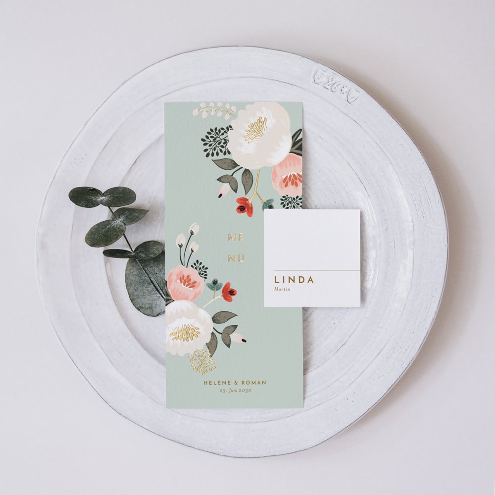 Die Vorfreude auf kulinarische Highlights macht jedes Fest noch besonderer! Lassen Sie Ihre Gäste schon vor dem ersten Gang wissen, welche Köstlichkeiten sie erwarten – von der Vorspeise über das Hauptgericht bis zum Dessert, begleitet von einer erlesenen Auswahl an Getränken. Gestalten Sie eine stilvolle Menükarte oder Getränkekarte, die perfekt mit Ihrer Einladung und Tischdekoration harmoniert. So informieren Sie nicht nur über die Speisen und Getränke, sondern setzen zugleich ein dekoratives Highlight. Unser Tipp: Platzieren Sie die Karten direkt an jedem Sitzplatz oder zentral auf den Tischen, um Ihre Festtafel stilvoll abzurunden.
