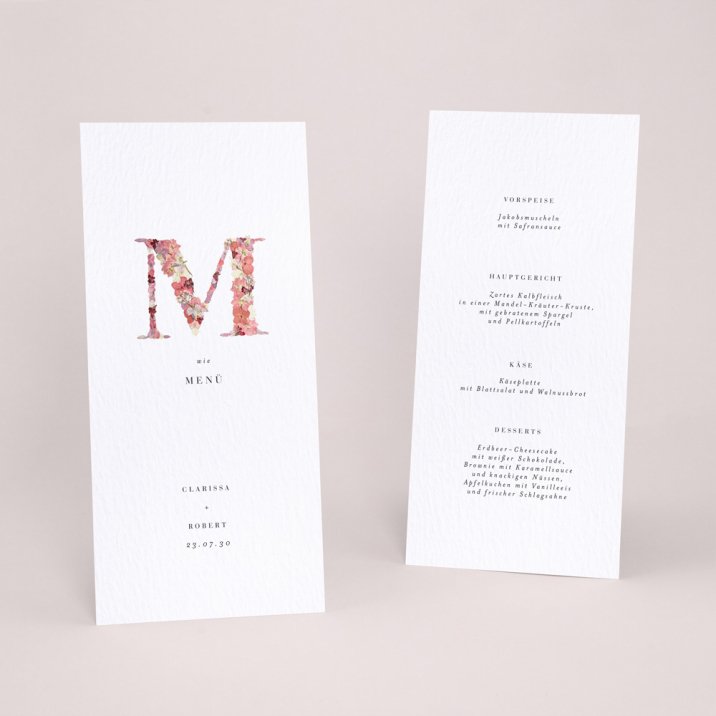Die Vorfreude auf kulinarische Highlights macht jedes Fest noch besonderer! Lassen Sie Ihre Gäste schon vor dem ersten Gang wissen, welche Köstlichkeiten sie erwarten – von der Vorspeise über das Hauptgericht bis zum Dessert, begleitet von einer erlesenen Auswahl an Getränken. Gestalten Sie eine stilvolle Menükarte oder Getränkekarte, die perfekt mit Ihrer Einladung und Tischdekoration harmoniert. So informieren Sie nicht nur über die Speisen und Getränke, sondern setzen zugleich ein dekoratives Highlight. Unser Tipp: Platzieren Sie die Karten direkt an jedem Sitzplatz oder zentral auf den Tischen, um Ihre Festtafel stilvoll abzurunden.