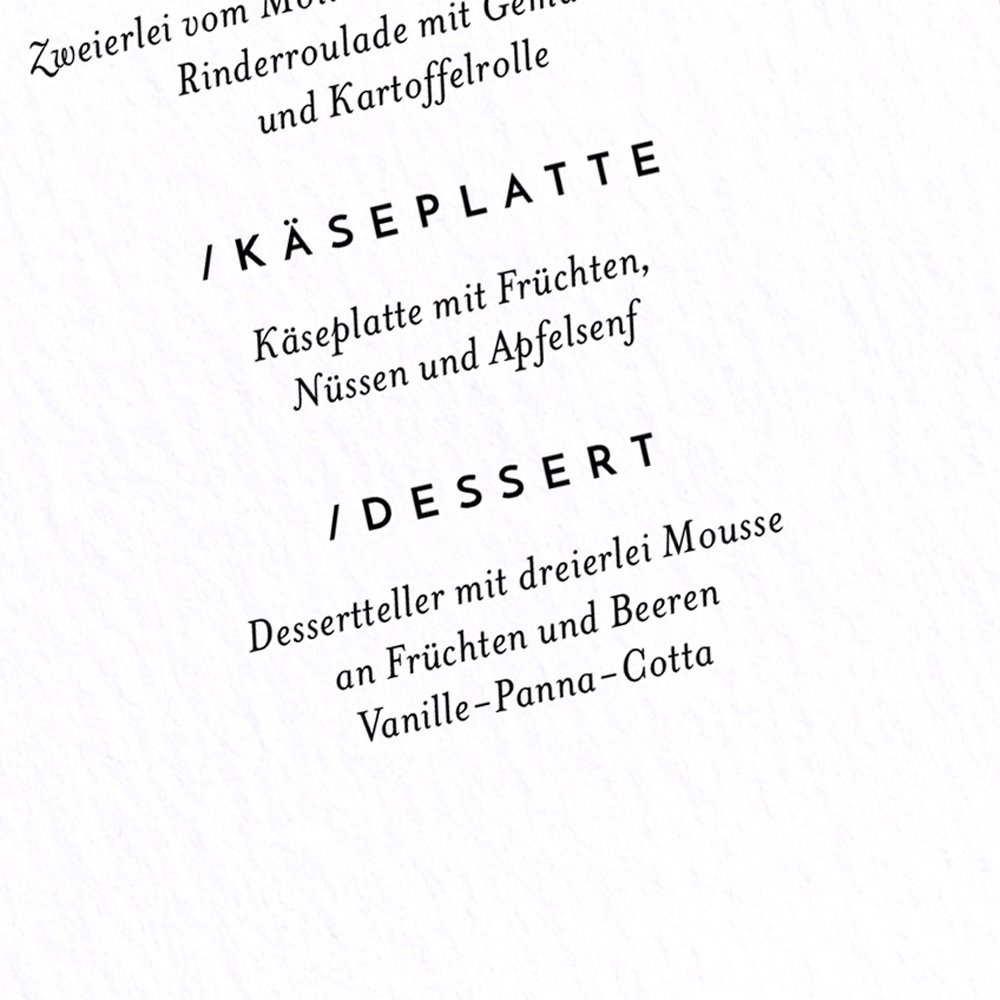 Die Vorfreude auf kulinarische Highlights macht jedes Fest noch besonderer! Lassen Sie Ihre Gäste schon vor dem ersten Gang wissen, welche Köstlichkeiten sie erwarten – von der Vorspeise über das Hauptgericht bis zum Dessert, begleitet von einer erlesenen Auswahl an Getränken. Gestalten Sie eine stilvolle Menükarte oder Getränkekarte, die perfekt mit Ihrer Einladung und Tischdekoration harmoniert. So informieren Sie nicht nur über die Speisen und Getränke, sondern setzen zugleich ein dekoratives Highlight. Unser Tipp: Platzieren Sie die Karten direkt an jedem Sitzplatz oder zentral auf den Tischen, um Ihre Festtafel stilvoll abzurunden.