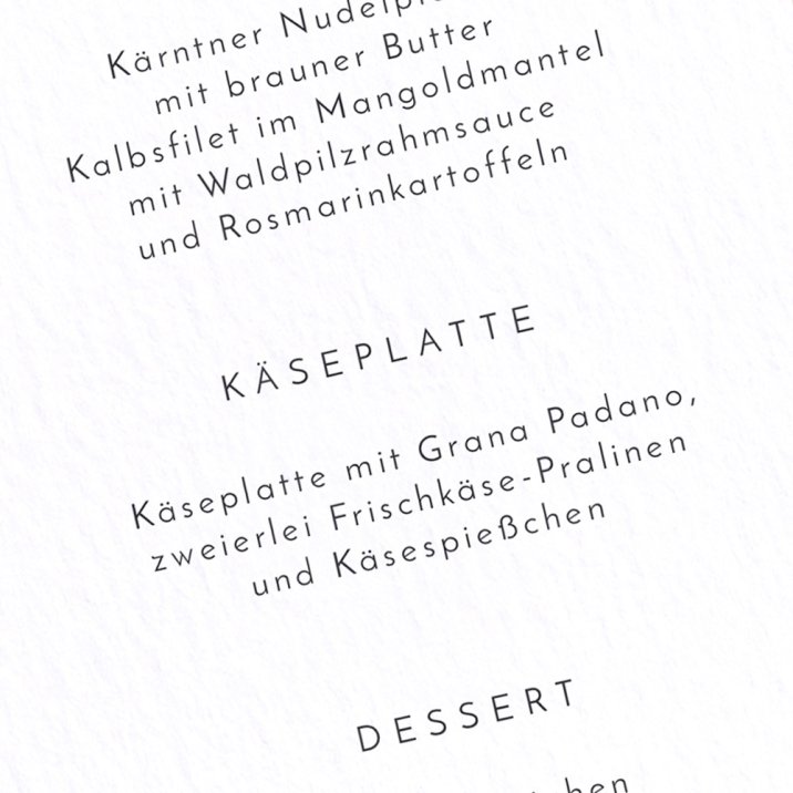 Die Vorfreude auf kulinarische Highlights macht jedes Fest noch besonderer! Lassen Sie Ihre Gäste schon vor dem ersten Gang wissen, welche Köstlichkeiten sie erwarten – von der Vorspeise über das Hauptgericht bis zum Dessert, begleitet von einer erlesenen Auswahl an Getränken. Gestalten Sie eine stilvolle Menükarte oder Getränkekarte, die perfekt mit Ihrer Einladung und Tischdekoration harmoniert. So informieren Sie nicht nur über die Speisen und Getränke, sondern setzen zugleich ein dekoratives Highlight. Unser Tipp: Platzieren Sie die Karten direkt an jedem Sitzplatz oder zentral auf den Tischen, um Ihre Festtafel stilvoll abzurunden.