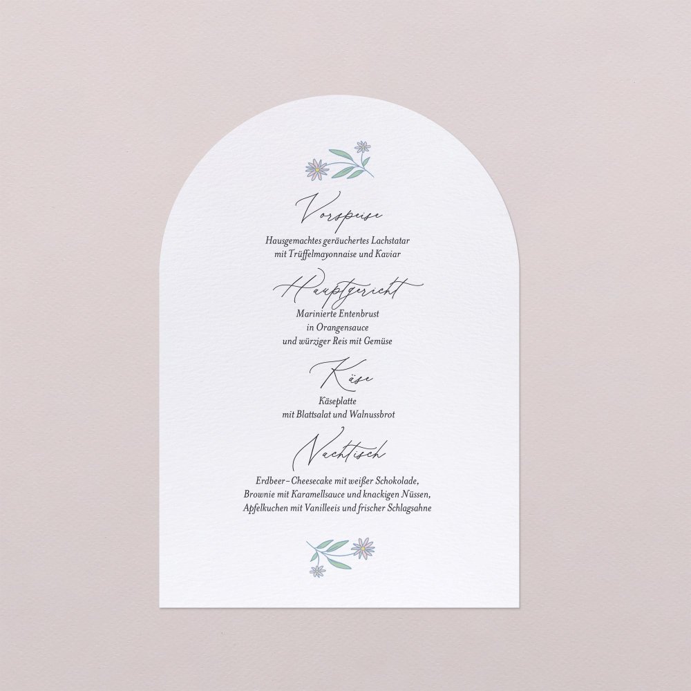 Mit seinem eleganten Bogenschnitt ist dieses Hochzeitsmenü, passend zu Ihren Einladungskarten, eine wunderbare Ergänzung Ihrer Tischdekoration. Präsentieren Sie es auf einem eleganten Kartenhalter aus Holz (optional erhältlich), legen Sie eine Karte auf jeden Teller oder schmücken Sie sie mit einer hübschen Schleife...