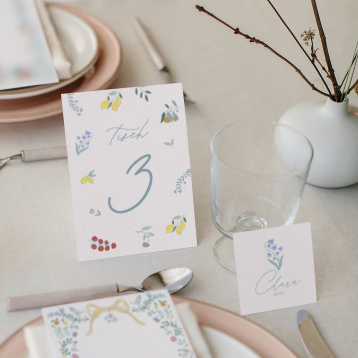 Das Design Baptistine zeigt Blumen und Früchte wie Zitronen und Orangen, die eine lebendige und frische Atmosphäre schaffen. Dieses farbenfrohe Motiv ist ideal für eine ländliche, schlichte Hochzeit und bringt eine natürliche, einladende Note in jedes Detail der Feier.