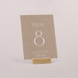 Passend zur Einladungskarte wird diese Tischnummer Ihre Dekoration am großen Tag perfekt ergänzen. Präsentieren Sie sie auf einem eleganten Kartenhalter aus Holz (optional erhältlich), binden Sie sie mit einer Schnur um eine mit Trockenblumen gefüllte Glasvase... lassen Sie Ihrer Fantasie freien Lauf!