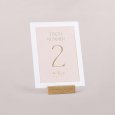Passend zur Einladungskarte wird diese Tischnummer Ihre Dekoration am großen Tag perfekt ergänzen. Präsentieren Sie sie auf einem eleganten Kartenhalter aus Holz (optional erhältlich), binden Sie sie mit einer Schnur um eine mit Trockenblumen gefüllte Glasvase... lassen Sie Ihrer Fantasie freien Lauf!
