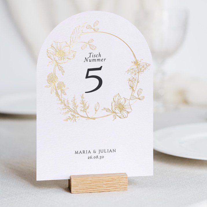 In der Mitte des Tisches platziert hilft die Tischnummer in Bogenform Ihren Gästen, ihren Ehrenplatz für den Abend zu finden.