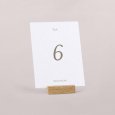 Passend zur Einladungskarte wird diese Tischnummer Ihre Dekoration am großen Tag perfekt ergänzen. Präsentieren Sie sie auf einem eleganten Kartenhalter aus Holz (optional erhältlich), binden Sie sie mit einer Schnur um eine mit Trockenblumen gefüllte Glasvase... lassen Sie Ihrer Fantasie freien Lauf!