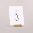 Passend zur Einladungskarte wird diese Tischnummer Ihre Dekoration am großen Tag perfekt ergänzen. Präsentieren Sie sie auf einem eleganten Kartenhalter aus Holz (optional erhältlich), binden Sie sie mit einer Schnur um eine mit Trockenblumen gefüllte Glasvase... lassen Sie Ihrer Fantasie freien Lauf!