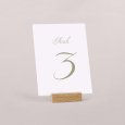 Passend zur Einladungskarte wird diese Tischnummer Ihre Dekoration am großen Tag perfekt ergänzen. Präsentieren Sie sie auf einem eleganten Kartenhalter aus Holz (optional erhältlich), binden Sie sie mit einer Schnur um eine mit Trockenblumen gefüllte Glasvase... lassen Sie Ihrer Fantasie freien Lauf!