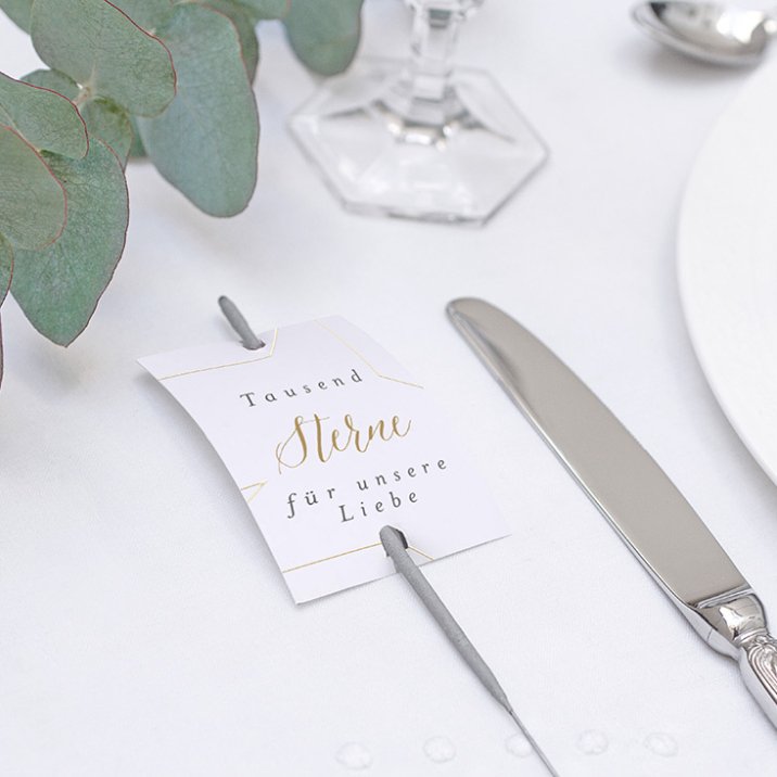 Unser Tipp: Legen Sie die Wunderkerzen mit diesen Etiketten am jeweiligen Platz des Gastes auf den Hochzeitstischen aus!