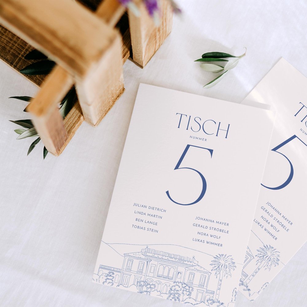 Wir empfehlen eine Karte pro Tisch. Am Eingang ausgelegt zeigen Sie Ihren Gästen auf eine einfache aber charmante Art, wo und mit welchen Tischnachbarn sie das Vergnügen haben.