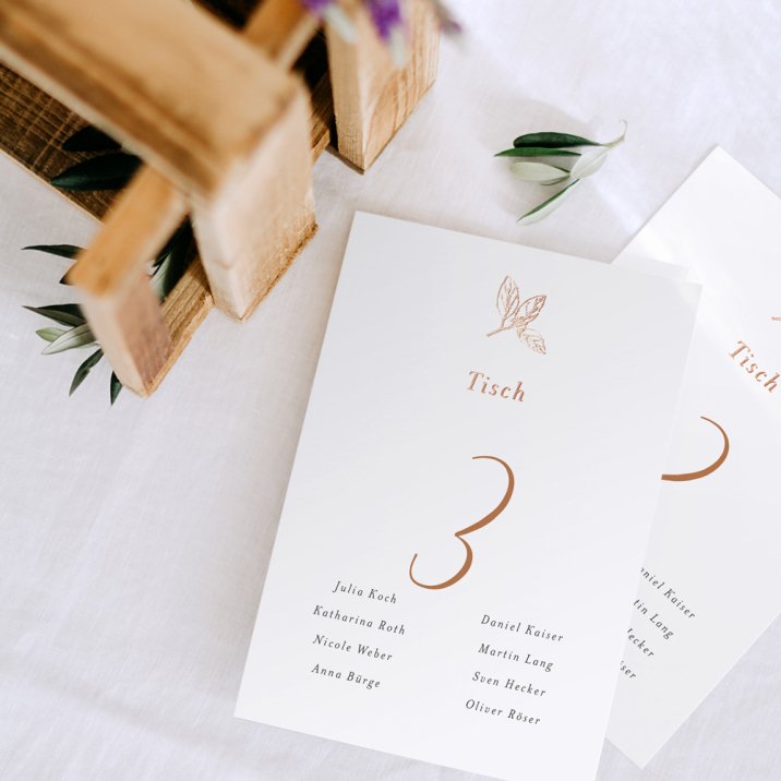 Wir empfehlen eine Karte pro Tisch. Am Eingang ausgelegt zeigen Sie Ihren Gästen auf eine einfache aber charmante Art, wo und mit welchen Tischnachbarn sie das Vergnügen haben.