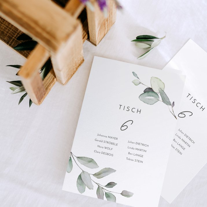 Wir empfehlen eine Karte pro Tisch. Am Eingang ausgelegt zeigen Sie Ihren Gästen auf eine einfache aber charmante Art, wo und mit welchen Tischnachbarn sie das Vergnügen haben.
