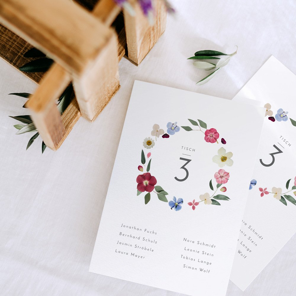 Wir empfehlen eine Karte pro Tisch. Am Eingang ausgelegt zeigen Sie Ihren Gästen auf eine einfache aber charmante Art, wo und mit welchen Tischnachbarn sie das Vergnügen haben.