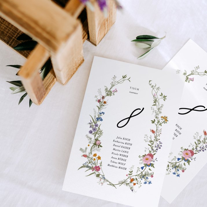Wir empfehlen eine Karte pro Tisch. Am Eingang ausgelegt zeigen Sie Ihren Gästen auf eine einfache aber charmante Art, wo und mit welchen Tischnachbarn sie das Vergnügen haben.