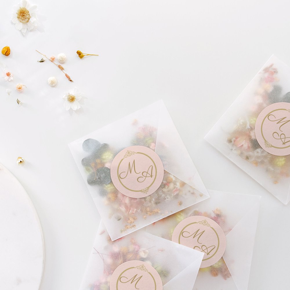 Mit diesen hübschen kleinen Hochzeitsaufklebern im Design Ihrer Karten beweisen Sie Liebe zum Detail!
