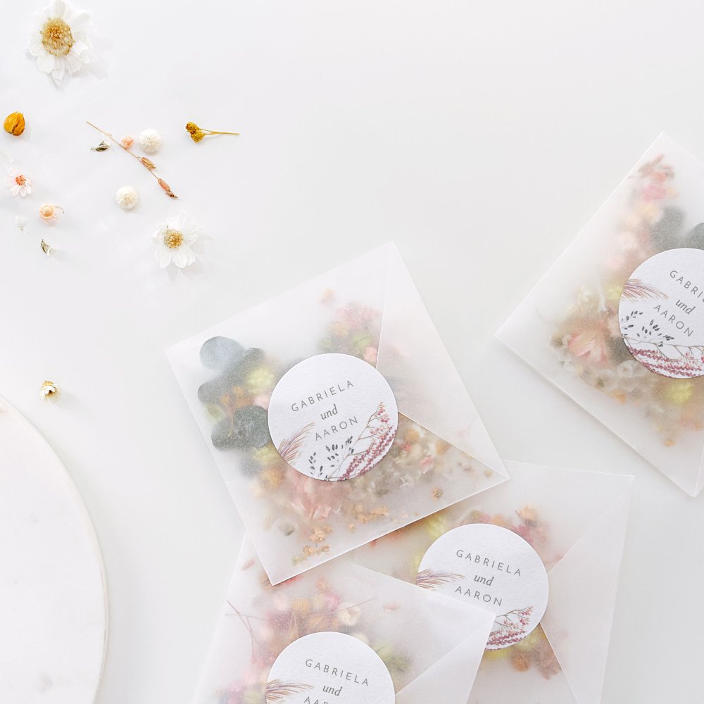 Mit diesen hübschen kleinen Hochzeitsaufklebern im Design Ihrer Karten beweisen Sie Liebe zum Detail!