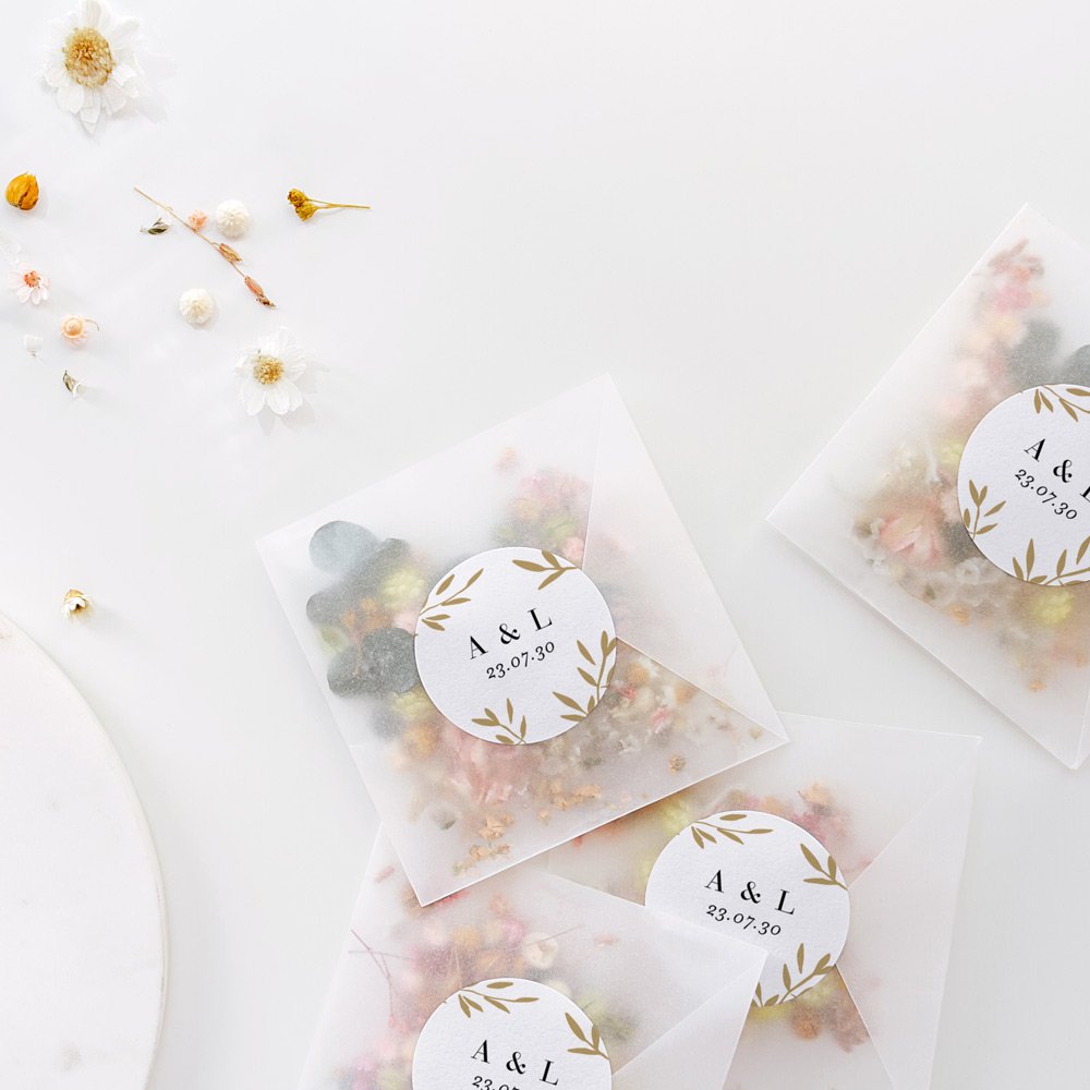 Mit diesen hübschen kleinen Hochzeitsaufklebern im Design Ihrer Karten beweisen Sie Liebe zum Detail!