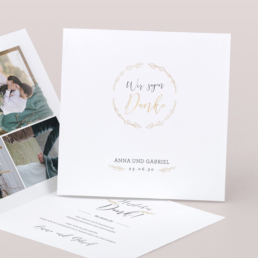 Eine Danksagungskarte ist die perfekte Art, um sich bei Familie und Freunden für ein wunderbares Hochzeitsfest zu bedanken. Die Karte ist beidseitig personalisierbar und bietet viel Platz für persönliche Dankesworte und die schönsten Fotos vom Fest.